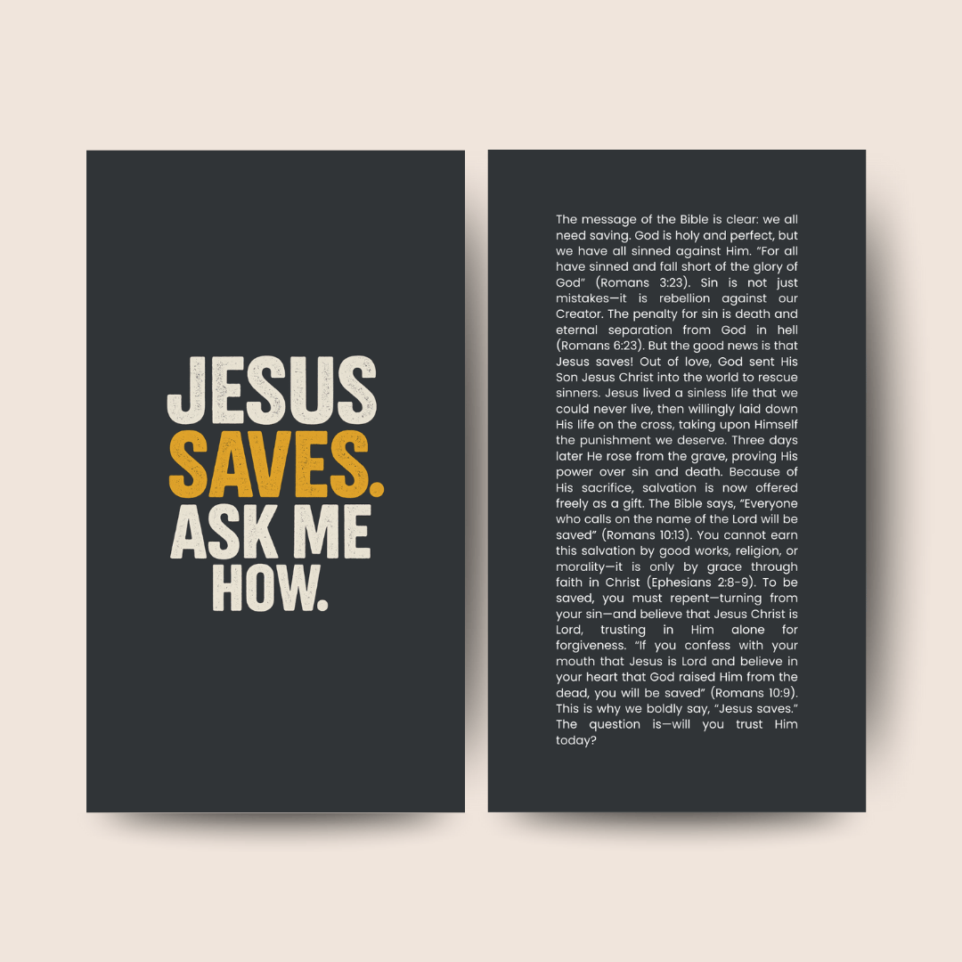 Bold. Clear. Conversation-starting. The “Jesus Saves. Ask Me How.” Gospel Tracts are designed to open the door for sharing the greatest message of all time—the saving work of Jesus Christ. With a striking front design and a clear gospel explanation on the back, these tracts help believers turn everyday encounters into eternal opportunities.